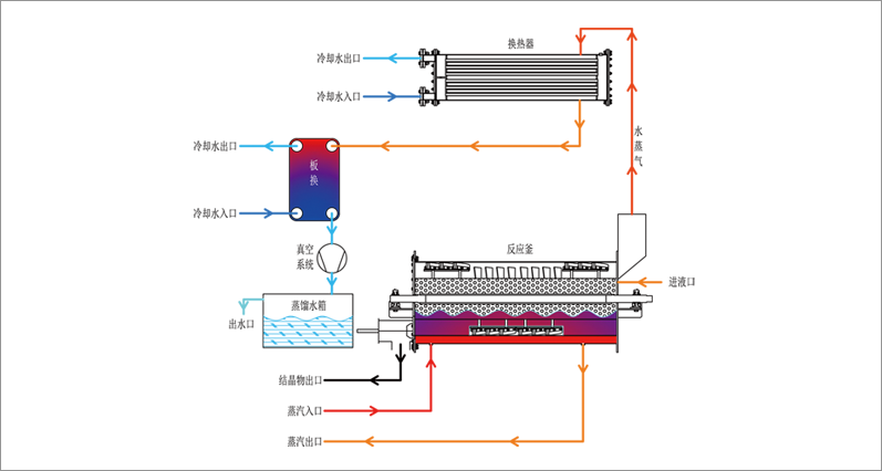 2-蒸餾:廢液在真空下在蒸餾罐中被攪拌、加熱后沸騰蒸發(fā),形成的水蒸汽被冷卻后變?yōu)檎麴s水從緩沖罐中排出,加熱用的水蒸汽換熱后變成冷凝水從蒸汽排水槽中排出;
